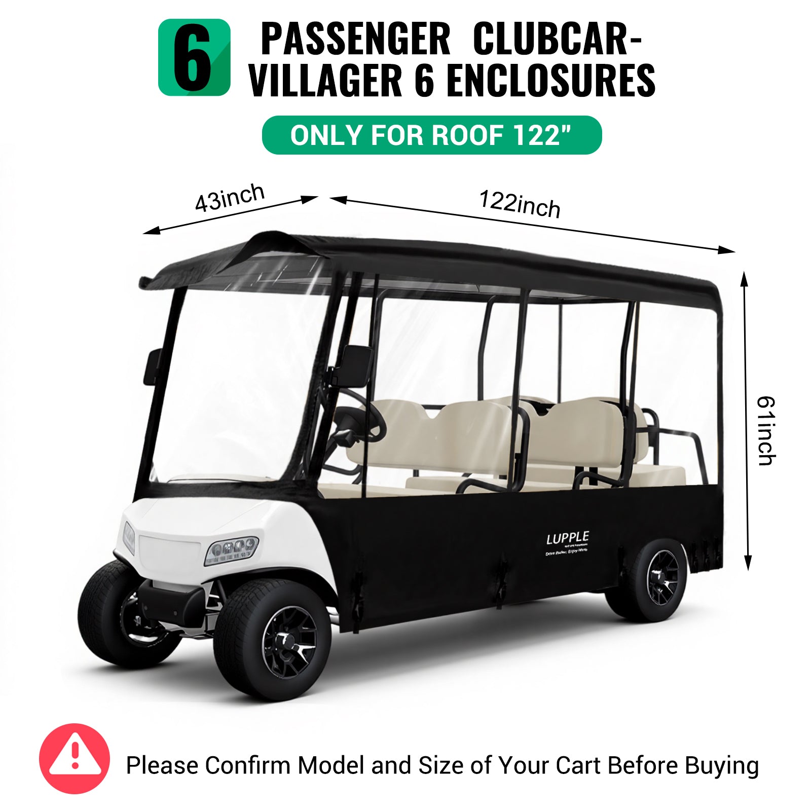 6 Passenger Enclosure for Club Car, 122.05 in Roof, 600D+PVC, 4-Side Zip Doors, Elastic Hem & Hooks