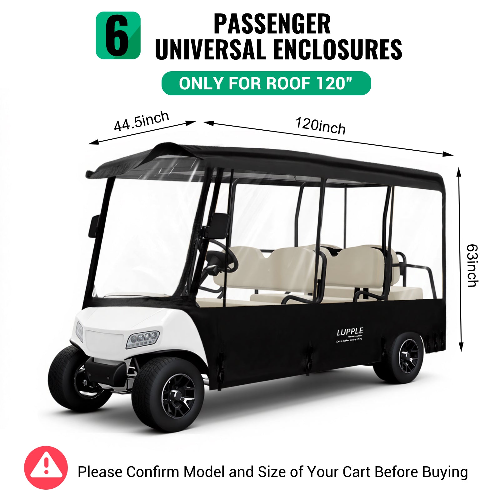 - Universal 6 Passenger Golf Cart Enclosure: Rain cover size 120x44x63in. Designed for a tight fit with bottom elastic and adjustable hooks. Compatible with modified 6-seaters